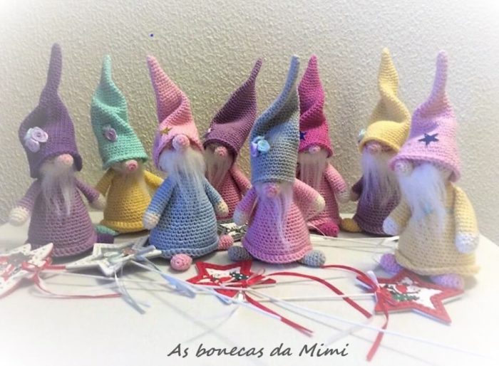 Tricotados com mil pontos de carinho, por uma generosa e talentosa artesã, têm cerca de 20 cm de altura, narizes aprimorados e são travessos como só os gnomos sabem ser. Para conhecer o seu trabalho, clique no nome Bonecas da Mimi, e deixe o seu “gosto” na página.