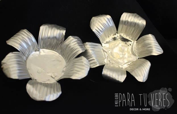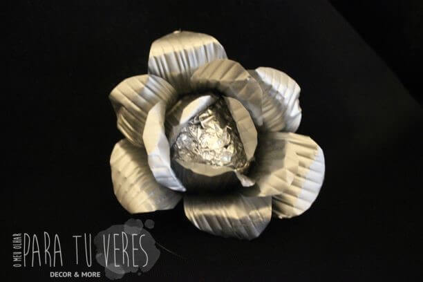 É só recortar as folhas como mostramos na fotografia e colá-las desencontradas com cola quente. O centro é feito com uma bolinha de papel prata e com as folhas mais fechadas. Espantosamente simples, simplesmente preciosas!