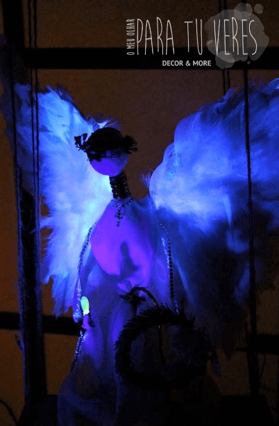 Criámos este anjo para uma amiga muito especial. Esperemos que goste dele tanto quanto ela. Materiais: – Arame – Argila branca – Tecido branco – Penas – Cola – Brilhantes autocolantes – Cordão dourado…