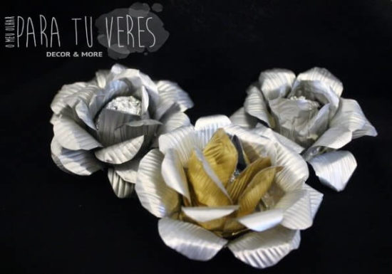 Hoje resolvemos mostrar-lhe as nossas “rosas miau” nas cores dourada e prateada. Chamamos-lhe rosas miau porque são feitas com as embalagens vazias de comida húmida para gatos. É só recortar as folhas como mostramos na…